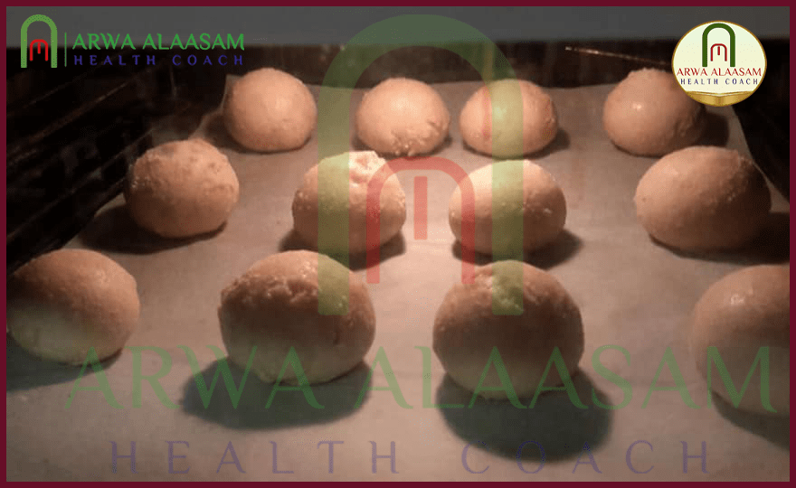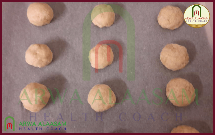 4-توضع بصينية فرن متباعدين (العجينة لزجة قليلا ممكن تلصق بايديك لذلك بامكانك دهن ايديك بزيت كيتوني للمساعدة على تشكيلها)